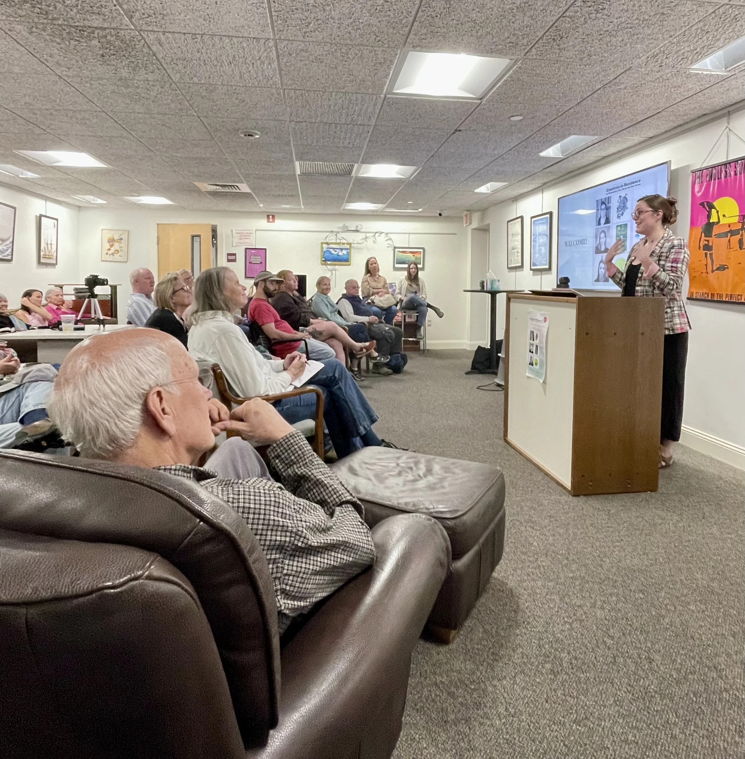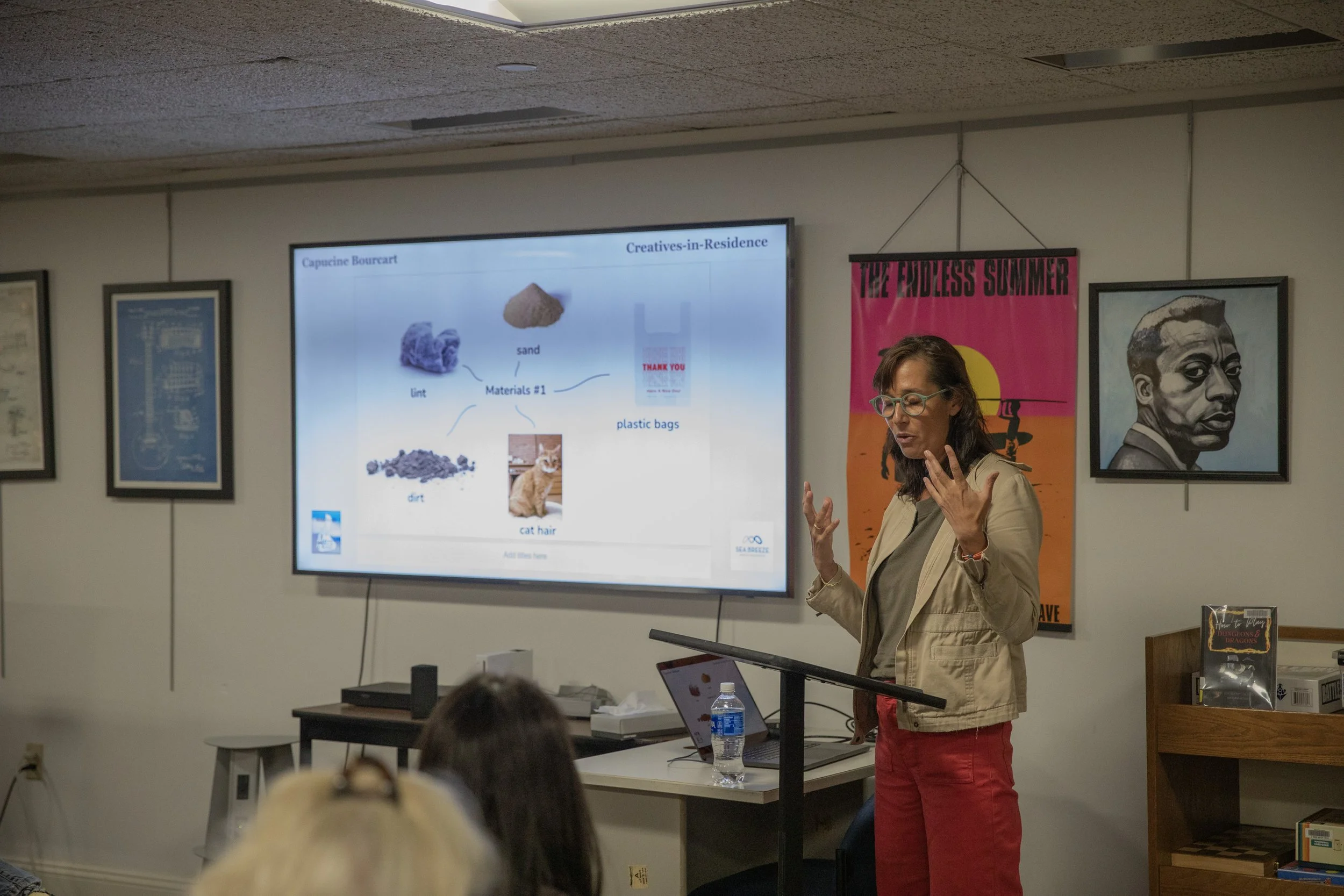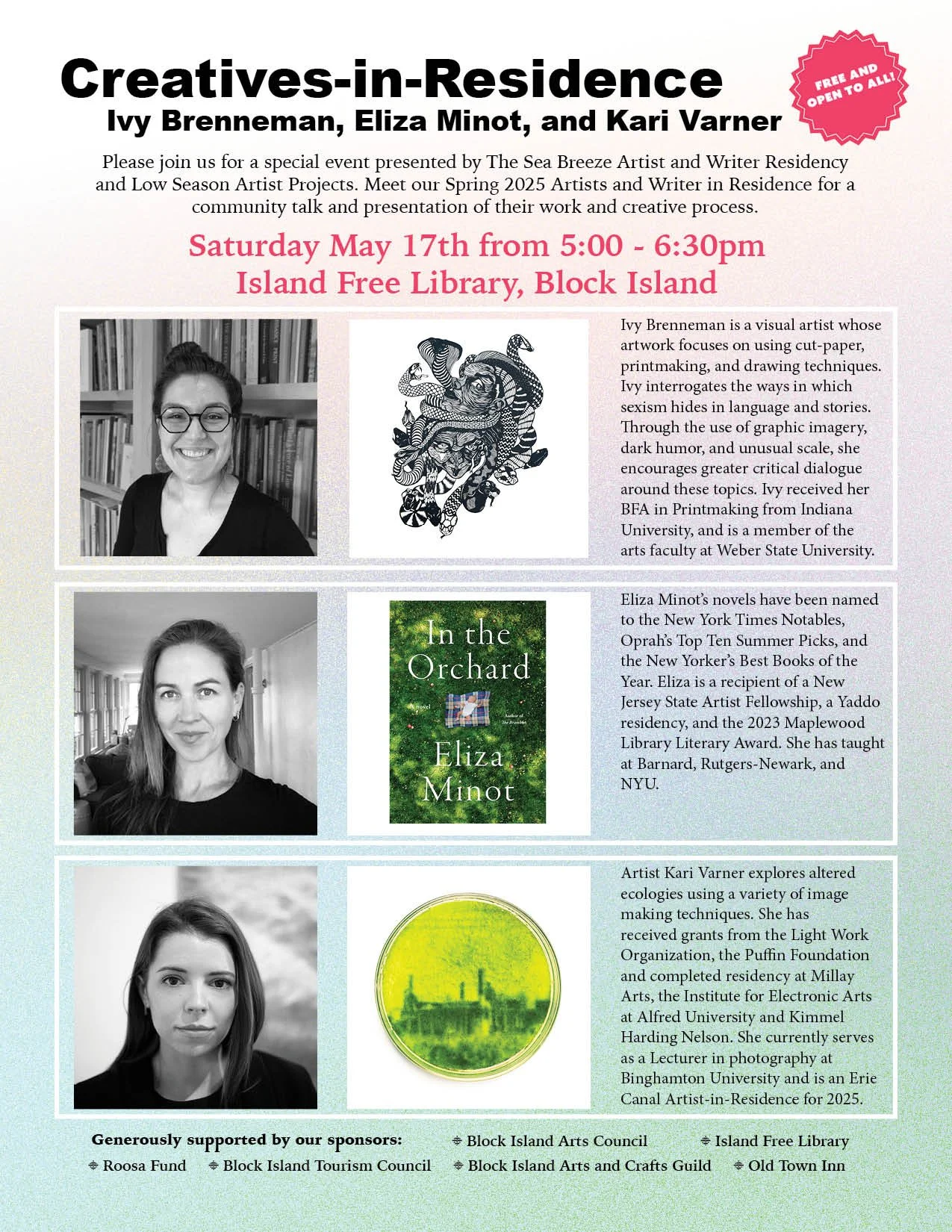 Both programs offer uninterrupted time to develop new work, explore creative ideas, and connect with the community. Residents are awarded a ten day stay through a juror-overseen application process, twice a year in the spring and fall. Residents are invited to fully immerse themselves in the unique environment of Block Island, stepping away from the demands of daily life to focus deeply on their creative practice, while also engaging with the local community. The residents provide island students with classes and workshops. For the broader community, studio open-houses and special events are offered free to the public.